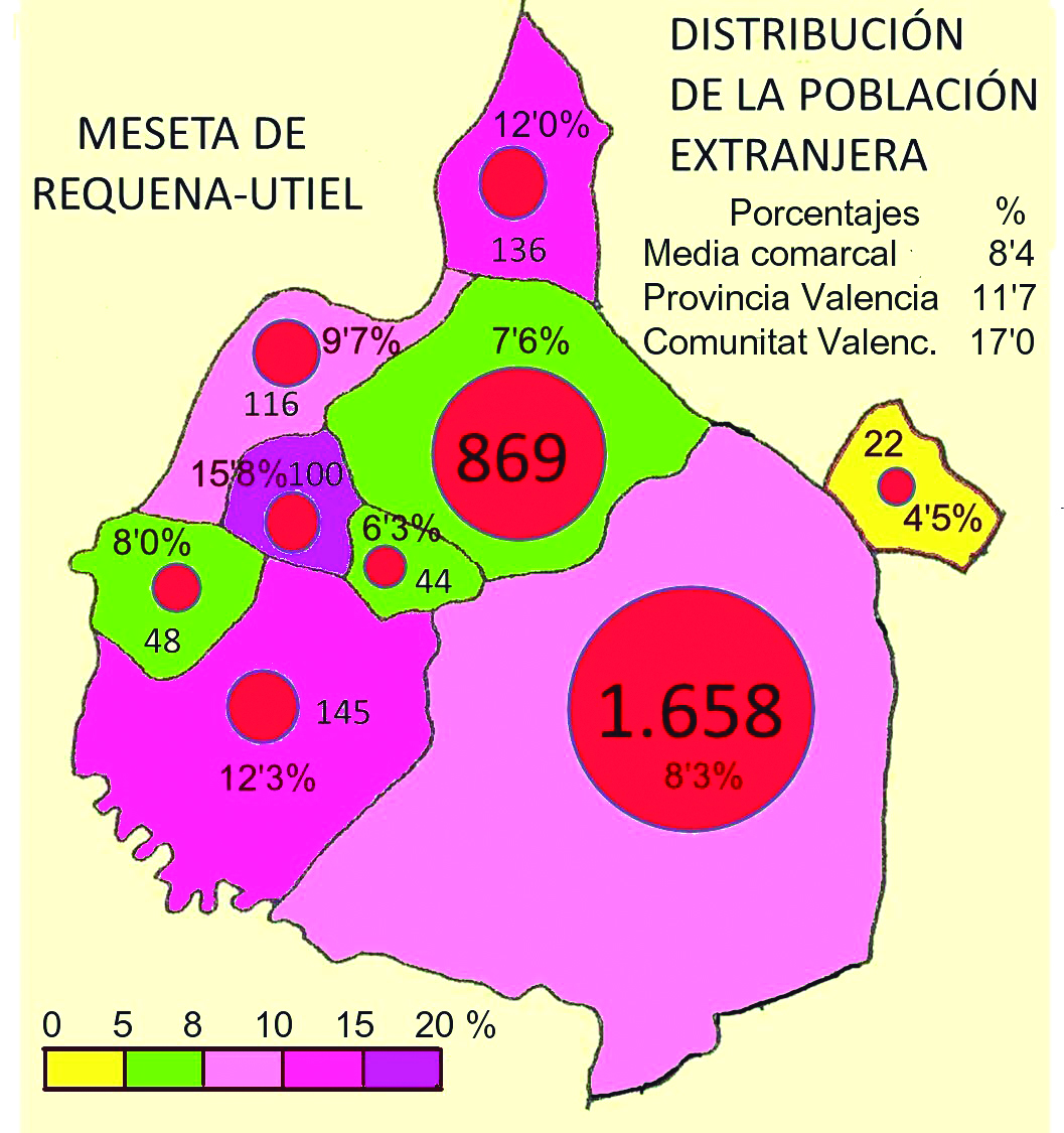 Durante siglos, la Meseta de Requena-Utiel ha sido un territorio que ha estado recibiendo inmigrantes de las comarcas colindantes de La Manchuela, Serranía de Cuenca, Valle de Cofrentes y Hoya de Buñol, la mayoría de ellos gente trabajadora que ha contribuido a la expansión de la agricultura, la industria y los servicios. Así ocurrió especialmente en el siglo XVIII, la segunda mitad del XIX y la primera del siglo XX. Por otra parte, se ha convertido en tierra de emisión en los momentos de cambio económico como el que impulsó al éxodo rural entre 1950 y 1985, cuando muchos de los jornaleros del campo y pequeños propietarios emigraron al Área Metropolitana de Valencia, Barcelona, Madrid e incluso a países extranjeros. La permanencia durante siglos de la inmigración y su integración en los lugares de acogida contribuyó de manera efectiva a crear una sociedad plural.