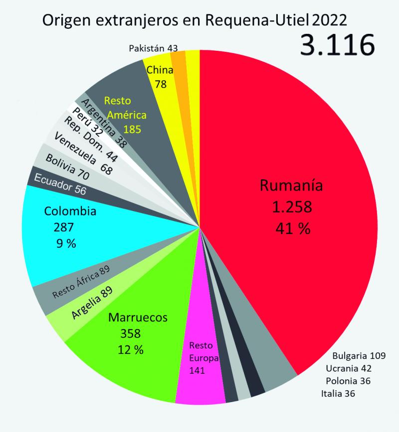 En 2022, el mayor contingente sigue siendo el rumano (41%), que es también el que mayor grado de integración ha tenido tanto en el sector agrario, como en los servicios comerciales y de restauración, así como en matrimonios mixtos con españoles. Le siguen los marroquíes (12% ) y los colombianos (9 %), seguidos de lejos por los búlgaros, argelinos, chinos, bolivianos, venezolanos, etc. (figura 1).