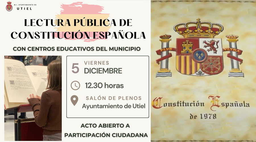 El Ayuntamiento de Utiel, con la colaboración de centros educativos del municipio, convoca un acto homenaje a la Constitución Española con la lectura pública de diferentes artículos de la Carta Magna que tendrá lugar mañana, viernes 5 de diciembre , a las 12.30 horas en el Salón de Plenos del consistorio.