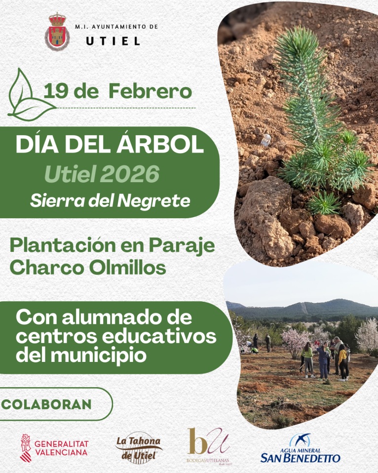La jornada, organizada por el Ayuntamiento de Utiel, contará con la colaboración de la Generalitat Valenciana en la donación de los plantones, así como de otras empresas que facilitan diferentes recursos de forma altruista para llevar a cabo esta jornada educativa y de convivencia con la que fomentar el cuidado de nuestro entorno natural.