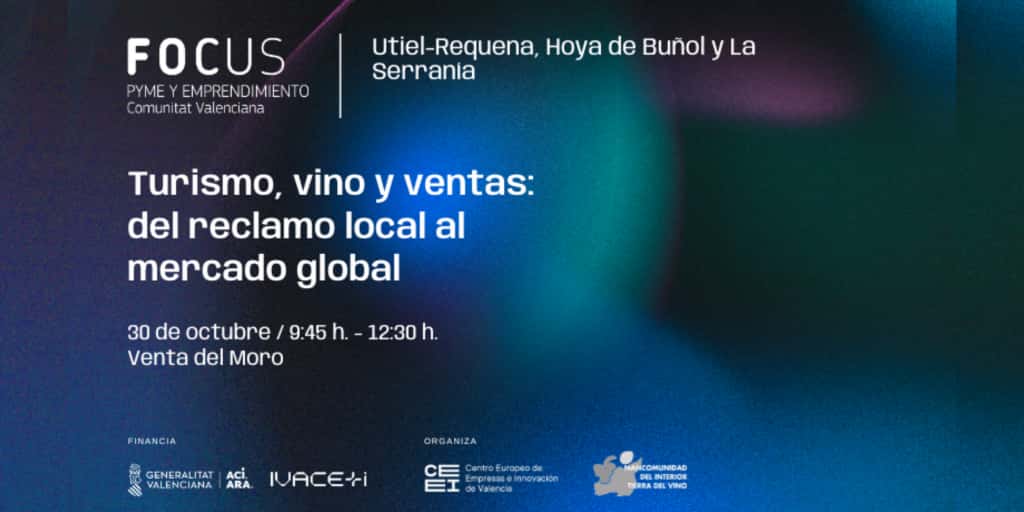 El próximo 30 de octubre, la Mancomunidad del Interior Tierra del Vino (MITV), a través de Adapt@+t, el programa de Empleo y Desarrollo Comarcal, ha preparado junto al Centro Europeo de Empresas e Innovación de Valencia (CEII), Rurable y Ruraltec, el FOCUS PYME Y EMPRENDIMIENTO: «Turismo, Vino y Ventas: del reclamo local al mercado global» que se llevará a cabo en Venta del Moro.