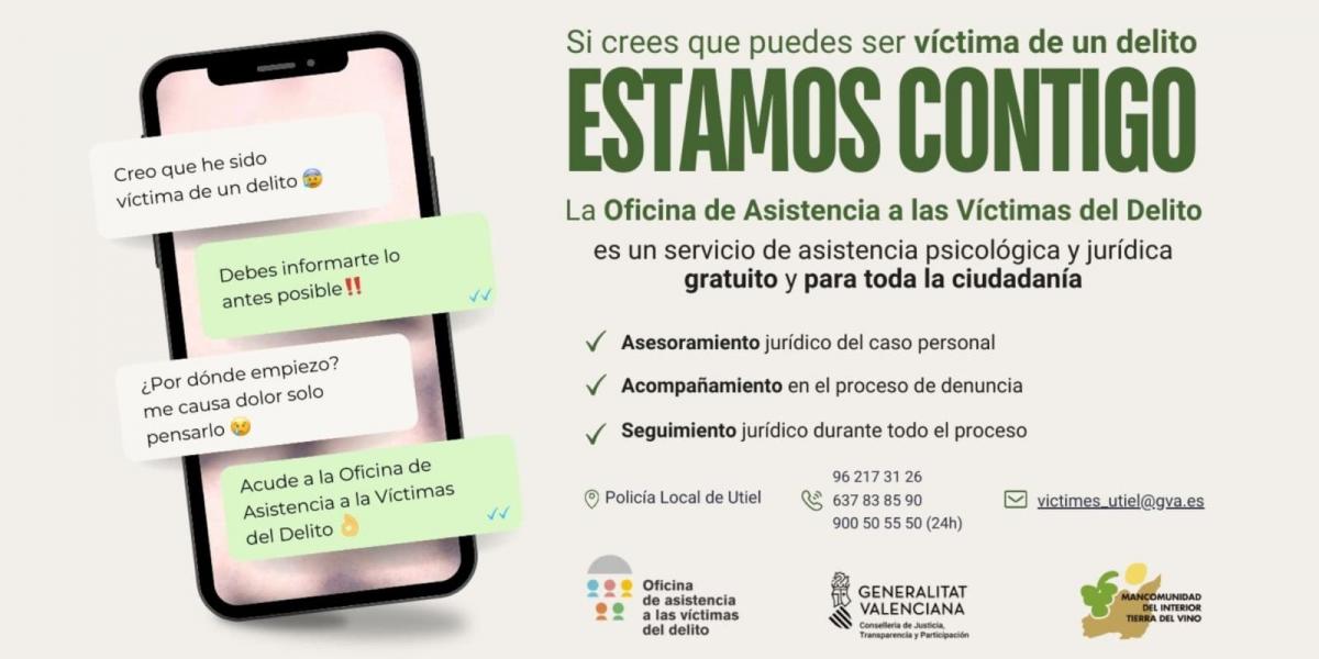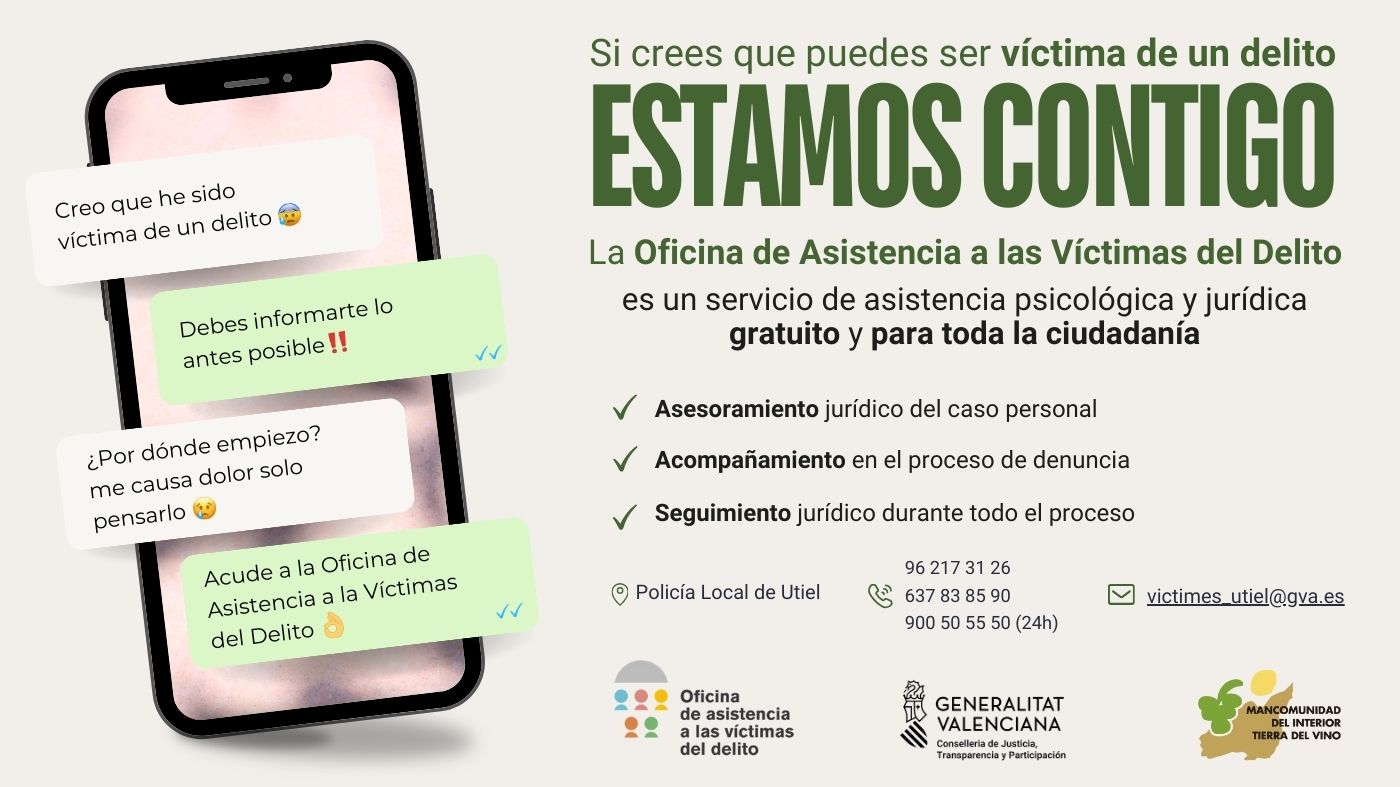 La sede de la Oficina se encuentra en la sede de la Policía Local de Utiel (Calle García Berlanga, 62). Para más información, se puede contactar a través de los teléfonos habilitados (96 217 31 26 y 637 83 85 90 o 900 50 55 50 habilitado 24 horas) o por correo electrónico victimes_utiel@gva.es.