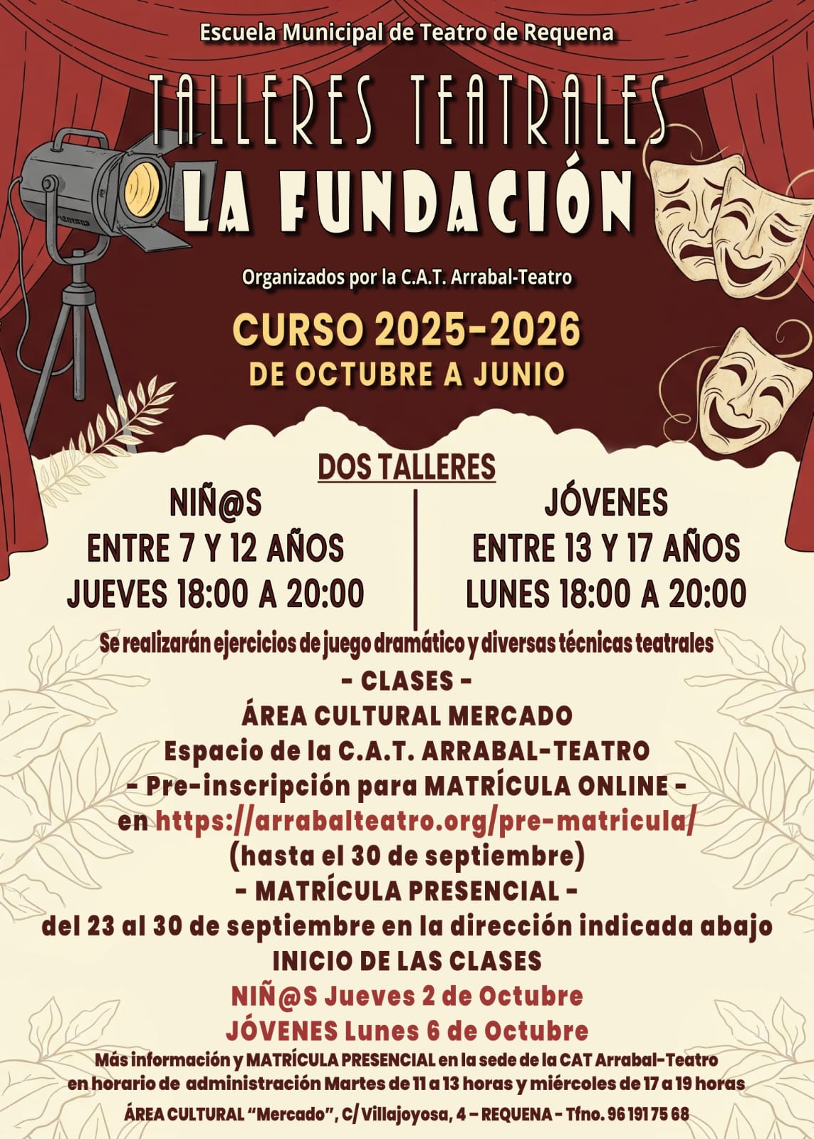 La CAT Arrabal-Teatro informa que está abierta la matrícula para los talleres teatrales “La Fundación” de la Escuela Municipal de Teatro de Requena para el curso 2025-2026.