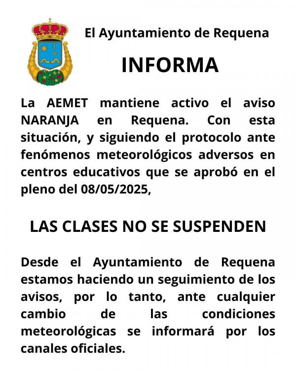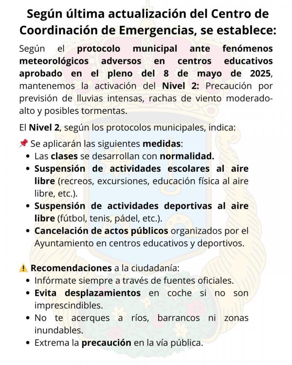 Según el protocolo municipal ante fenómenos meteorológicos adversos en centros educativos aprobado en el pleno del 08/05/2025: