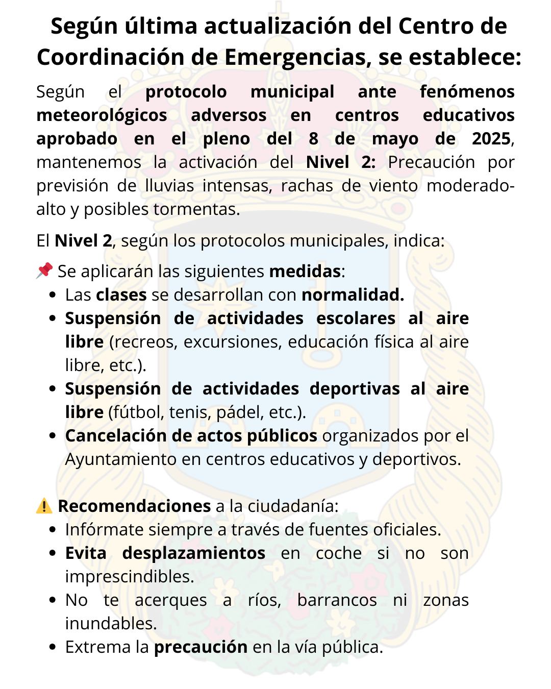 Desde el Ayuntamiento se está haciendo un seguimiento continuo. Cualquier cambio en los avisos se comunicará de inmediato por los canales oficiales.