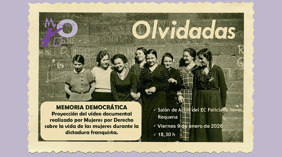 Desde la asociación MUJERES POR DERECHO queremos informar de que el próximo viernes día 9 de enero vamos a proyectar el documental OLVIDADAS, realizado por nuestra asociación en el año 2000 y presentado en el I Congreso de Historia Comarcal organizado por el CER en septiembre de 2001, con el que queremos realizar una actividad de recuperación y reconocimiento de la Memoria Democrática.