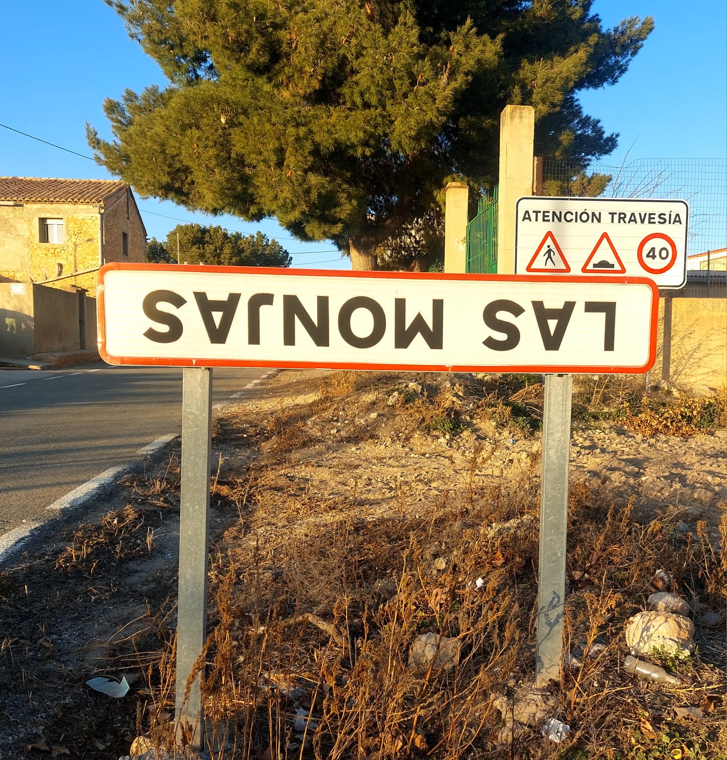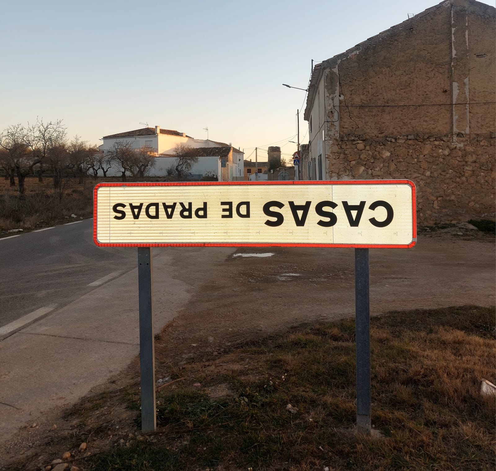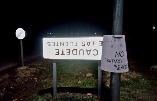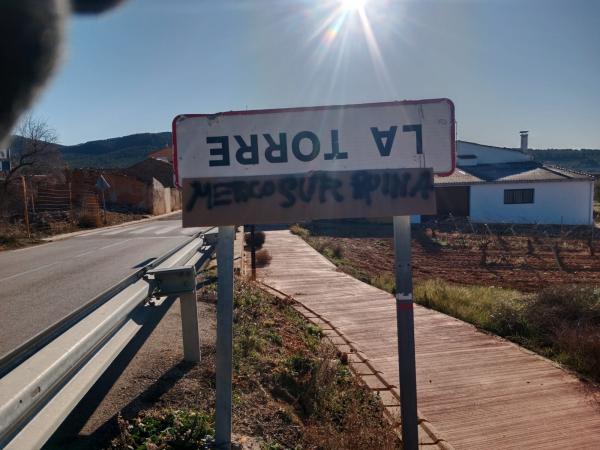 Esta acción reivindicativa busca visibilizar la precaria situación que enfrenta el campo mientras cada vez entran más alimentos de terceros países. Vamos, «el mundo al revés» como estas señales.