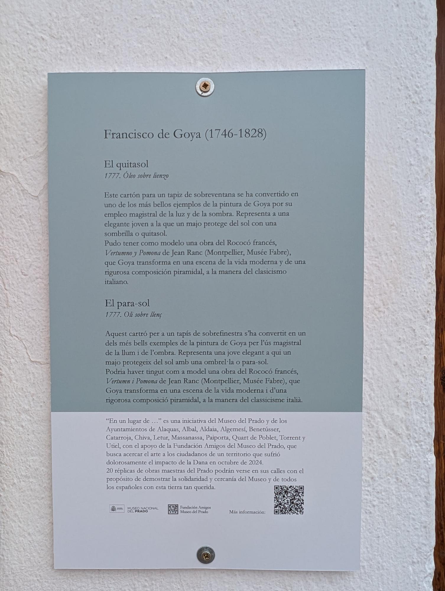Se trata de una de las actuaciones incluidas en el proyecto del Museo del Prado “En un lugar de la memoria…”. Una pinacoteca al aire libre, que se desplaza a municipios afectados por la DANA y que esta misma mañana representantes del Museo del Prado han presentado en Paiporta coincidiendo con la próxima celebración del Día Internacional de los Museos ( 18 de mayo).
