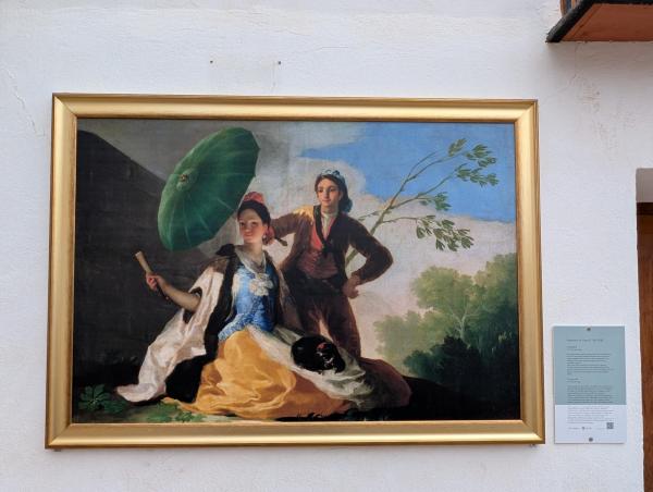 Este óleo sobre lienzo de 1777 , uno de los ejemplos más bellos de pintura de Goya por su empleo magistral de la luz y de la sombra , representa como motivo principal a una elegante joven, a la que un majo protege del sol con una sombrilla o quitasol.