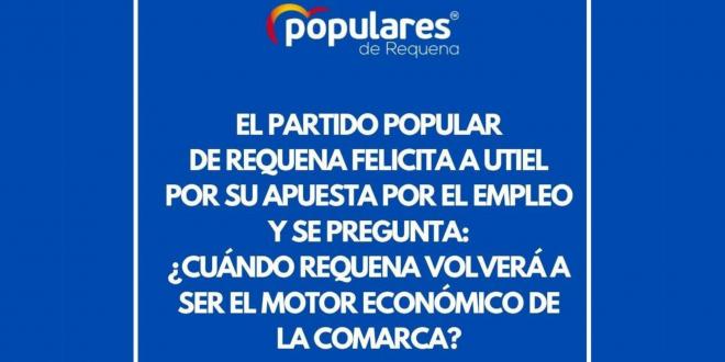 El Partido Popular de Requena felicita a Utiel por su apuesta por el empleo y se pregunta: ¿cuándo Requena volverá a ser el motor económico de la comarca?