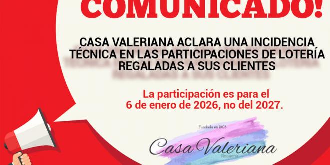 Casa Valeriana aclara una incidencia técnica en las participaciones de Lotería regaladas a sus clientes