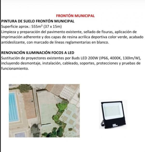 En cuanto a las instalaciones deportivas, se ejecutarán trabajos en el muro y vallado del campo de fútbol y en el frontón municipal. Además, se mejorarán distintos parques infantiles, como el de Fuente Chica, el Parque Nuevo, el patio del Colegio, el situado en la carretera Las Casas–Parchel y el parque de Realencos.