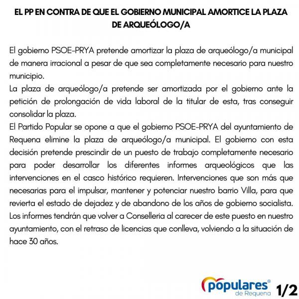 El Partido Popular se opone a que el gobierno PSOE-PRYA elimine la plaza de arqueólogo/a municipal. El gobierno con esta decisión pretende prescindir de un puesto de trabajo completamente necesario para poder desarrollar los diferentes informes arqueológicos que las intervenciones en el casco histórico requieren. Intervenciones que son más que necesarias para
