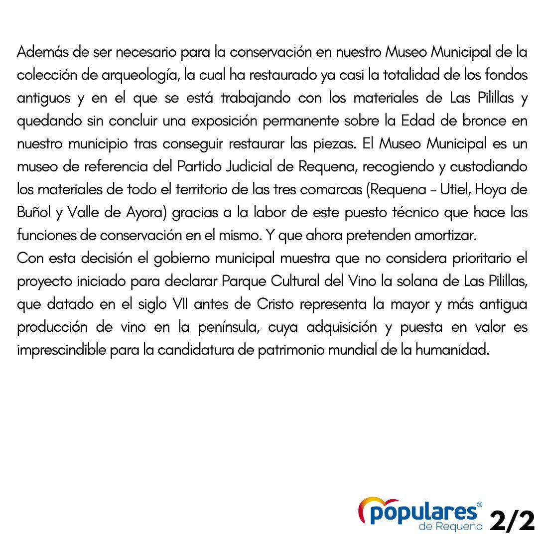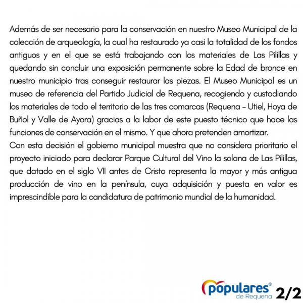 antiguos, y en el que se está trabajando con los materiales de Las Pilillas y quedando sin concluir una exposición permanente sobre la Edad de Bronce en nuestro municipio tras conseguir restaurar las piezas. El Museo Municipal es un museo de referencia del Partido Judicial de Requena, recogiendo y custodiando los materiales de todo el territorio de las tres comarcas (Requena – Utiel, Hoya de Buñol y Valle de Ayora) gracias a la labor de este puesto técnico en las labores de conservación en el mismo, y que ahora pretenden amortizar.