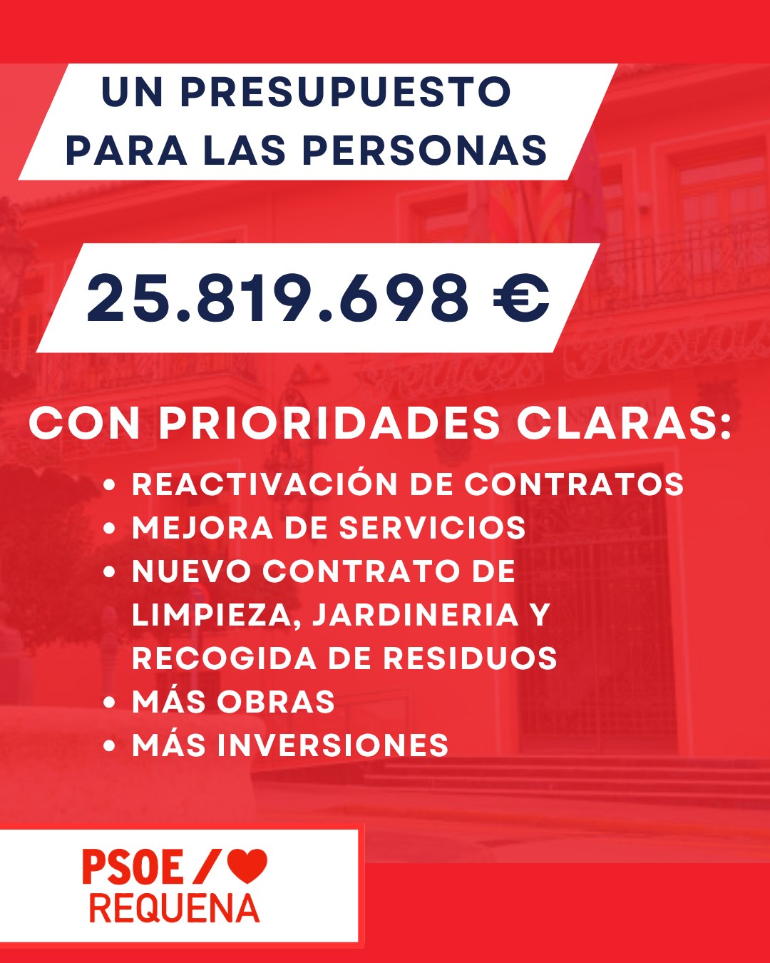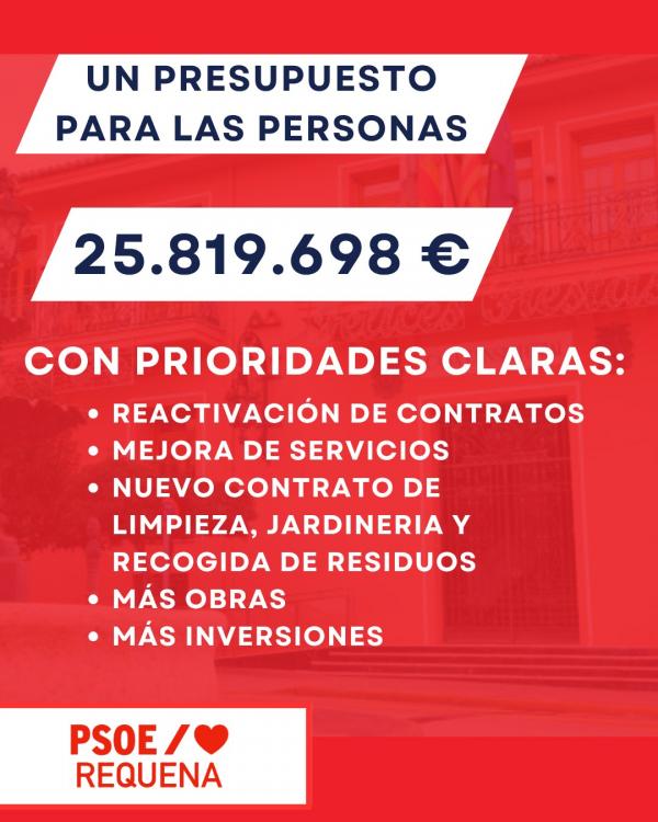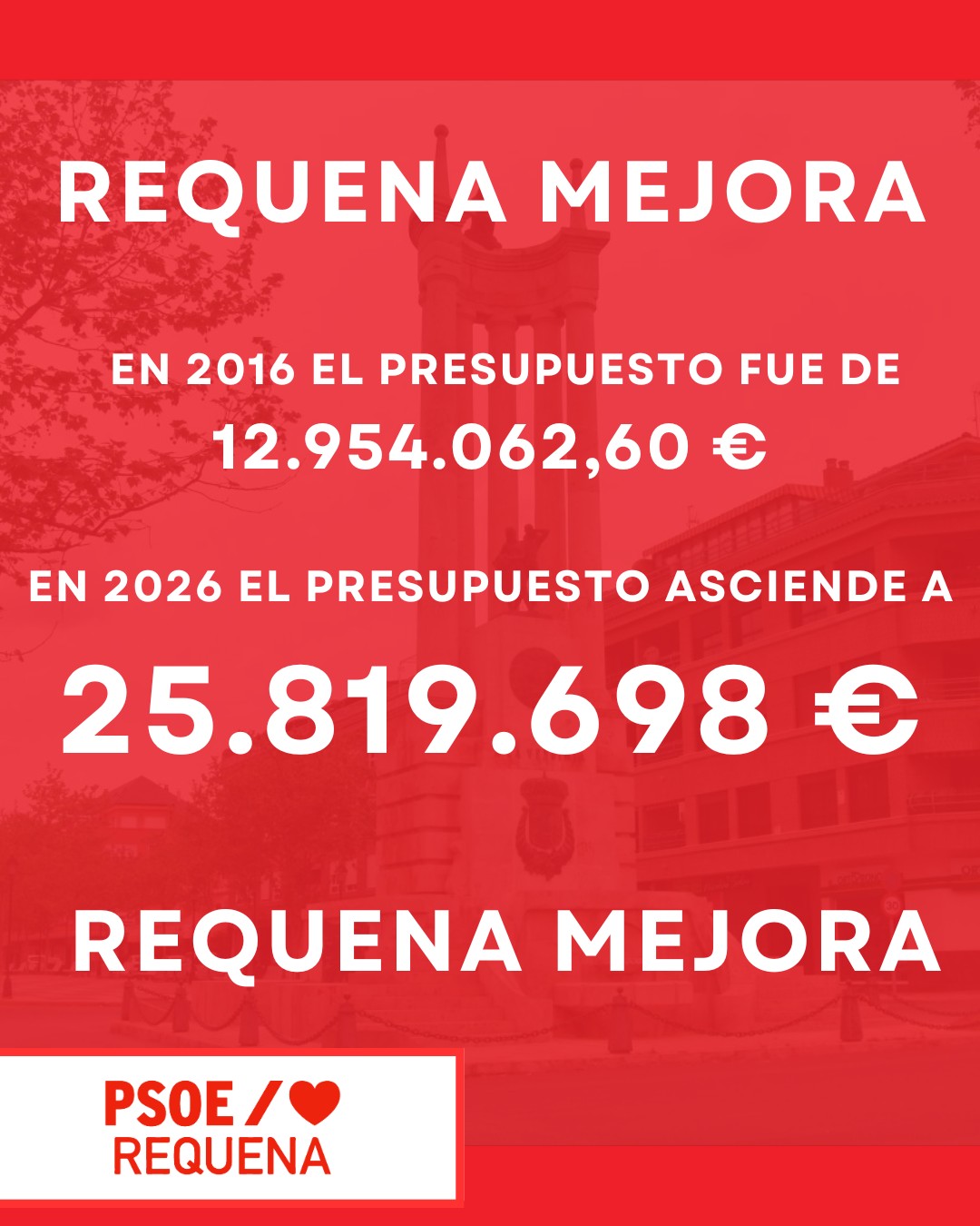«El presupuesto más grande de la historia. Un presupuesto de 25.819.698 € que marca el rumbo del gobierno que estamos construyendo: servicios públicos más fuertes, una Requena y aldeas más cuidadas y más oportunidades para todas y todos» afirma el PSOE de Requena.