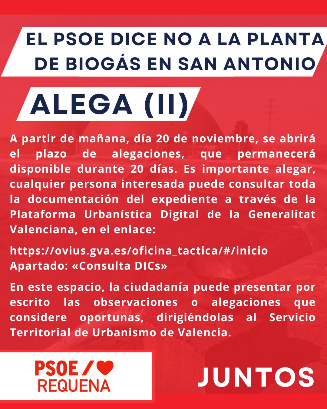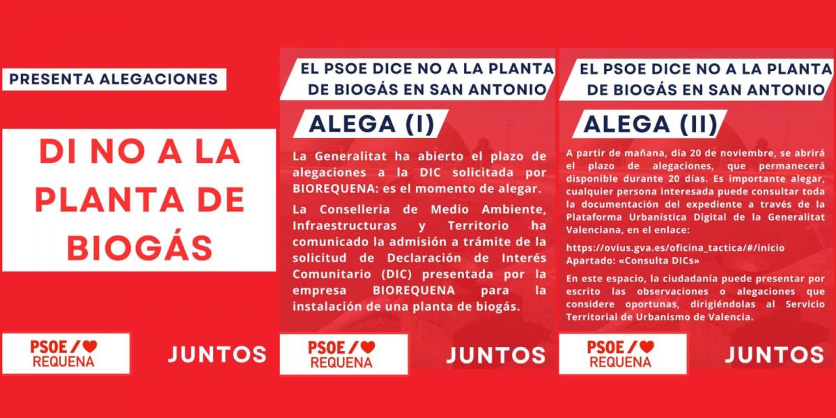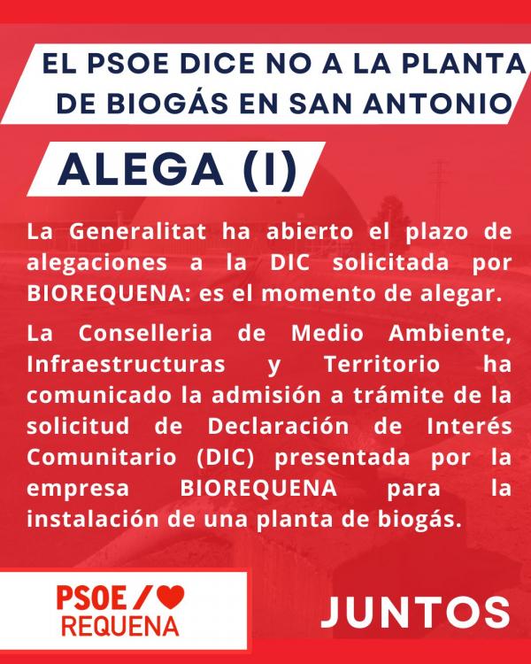 Desde el PSOE de Requena expresan su rechazo a la instalación de esta planta de biogás y van a abanderar las alegaciones y todas las acciones que estén en su mano para garantizar que en San Antonio y en Requena, la ciudadanía pueda respirar.