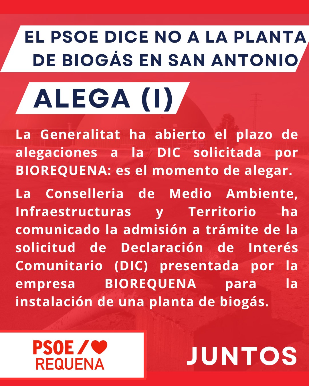 La Generalitat Valenciana ha abierto el plazo de alegaciones a la Declaración de Interés Comunitario (DIC) solicitada por BIOREQUENA para la instalación de una planta de biogás en San Antonio.