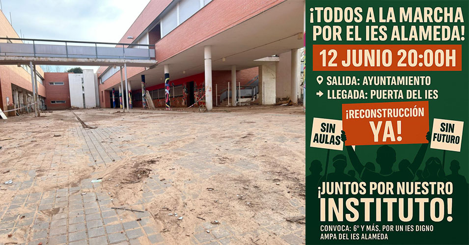 A pesar de las promesas, siete meses después de la DANA, Conselleria sigue sin tener un plan concreto de rehabilitación para el IES Alameda. Todavía no se han realizado las catas estructurales oportunas en el forjado sanitario del edificio para determinar el estado real del mismo. Hasta que no se tengan estas inspecciones del subsuelo y se tenga el informe definitivo, no podrán confirmar si es posible la rehabilitación del mismo.