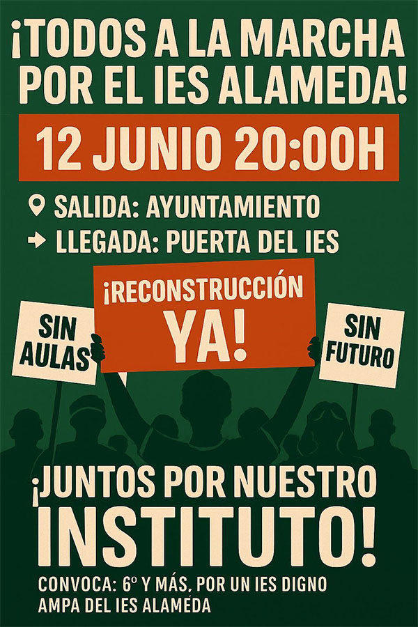 Las familias exigen a la Dirección general de Infraestructuras Educativas el expediente oficial donde se exhiba un cronograma de actuaciones sólido, fehaciente y concreto referente, de un lado, a la instalación de las aulas provisionales para el próximo curso; y de otro, a la urgente, necesaria e inexorable reconstrucción del edificio del IES Alameda.