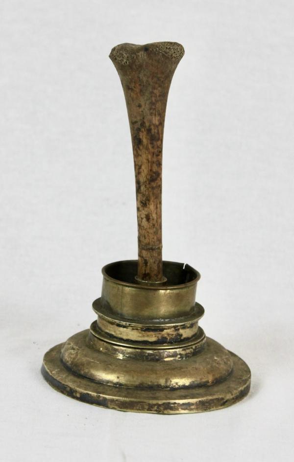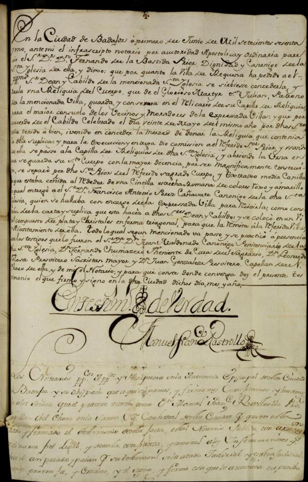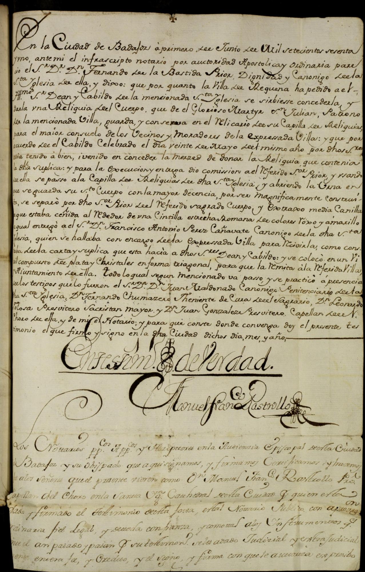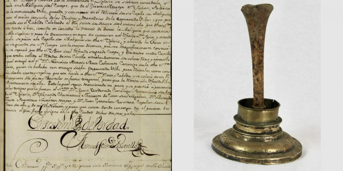 Pero tenemos constancia documental de otra reliquia de san Julián mártir donada por el prior Fernando de la Bastida a Requena en 1761 desde la capilla de las reliquias de la catedral de Badajoz. El acta detalla muy bien la extracción de la reliquia: «y abriendo la urna en que se guarda su santo cuerpo con la mayor decencia por ser magníficamente construida, se separó por dicho señor prior del referido sagrado cuerpo y extraxo media canilla la que estaba ceñida alrededor de una cintilla estrecha romana de colores roxo y amarillo… y se colocó en un viril compuesto de plata y christales en forma triagonal». Este proceso se hizo ante testigos. Esta canilla, tal como se denominaba la tibia en aquella época, bien puede corresponderse a la que se conserva como reliquia en la Iglesia de El Salvador de Requena de una altura de 14 cm y cuya fotografía incluimos en este «Documento del mes». Por otro documento sabemos que la reliquia de san Julián se instaló en una capilla en la Iglesia del Salvador, pero el Concejo protestó porque la quería en el oratorio que estaba en el propio Ayuntamiento, dándole la razón el canónigo de la catedral de Cuenca don Nicolás Crespo en noviembre de 1761.