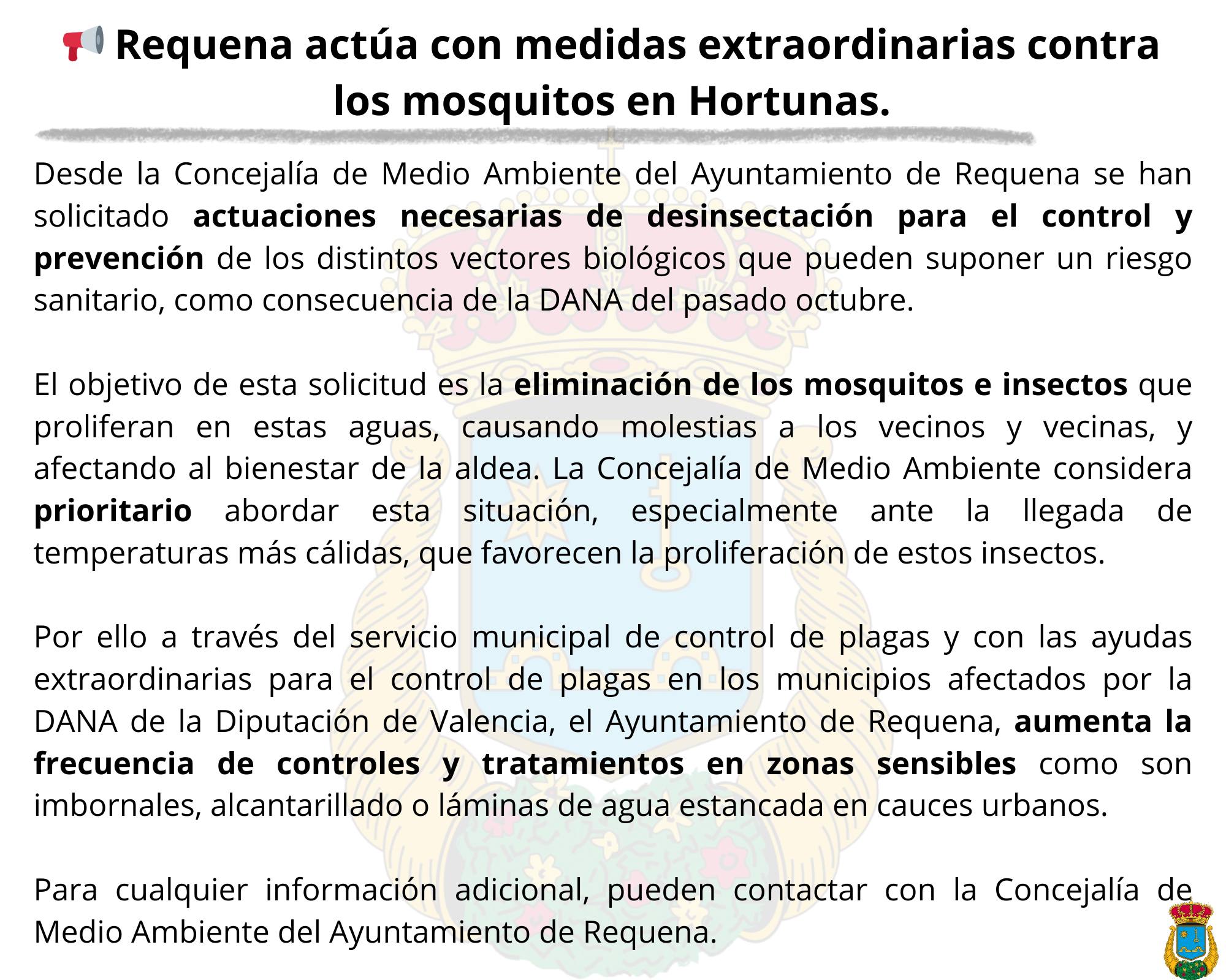 Desde la Concejalía de Medio Ambiente del Ayuntamiento de Requena se han solicitado actuaciones necesarias de desinsectación para el control y prevención de los distintos vectores biológicos que pueden suponer un riesgo sanitario por su capacidad de transmisión de enfermedades, como consecuencia de la DANA del pasado octubre.
