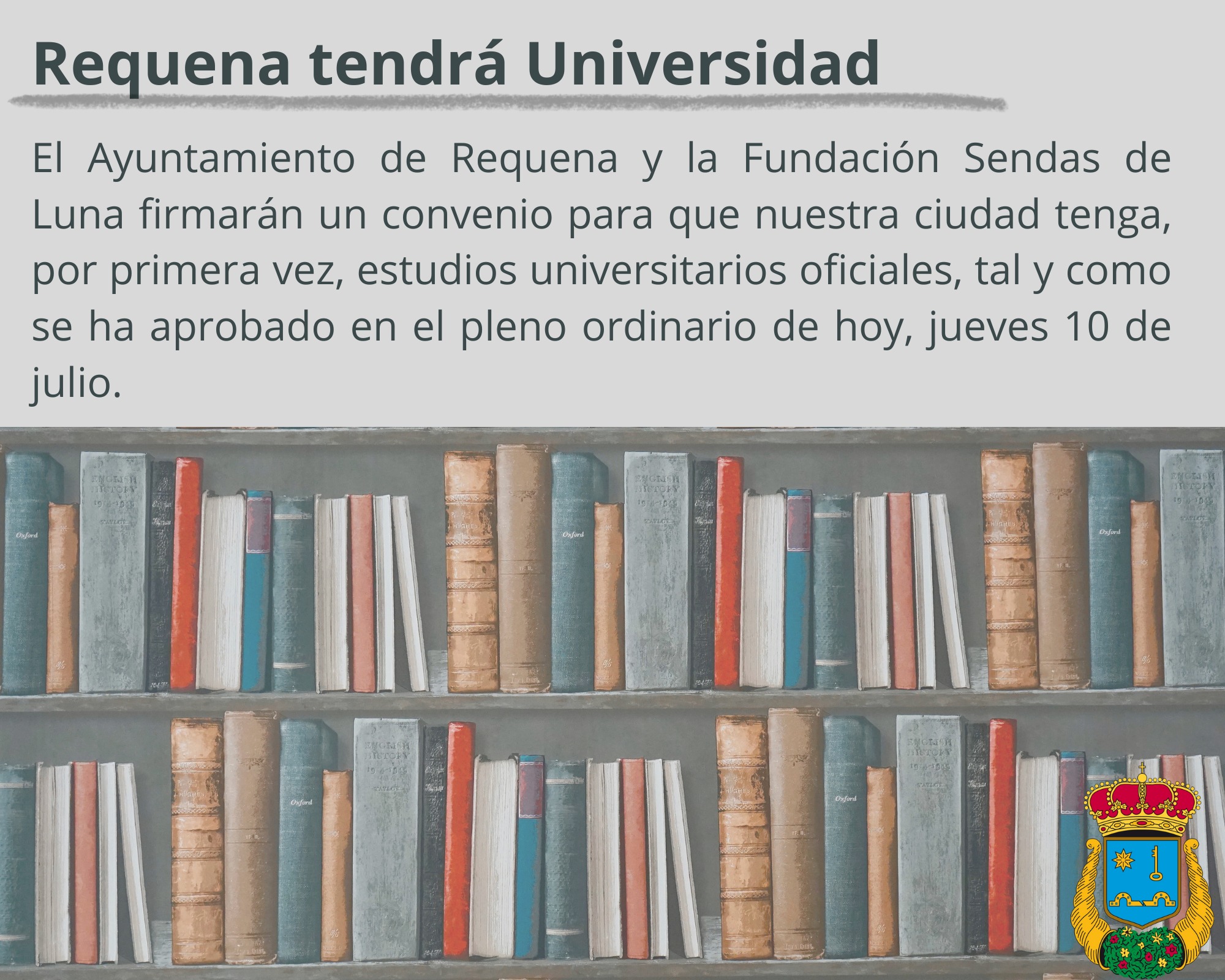 El Ayuntamiento de Requena y la Fundación Sendas de Luna firmarán un convenio para que nuestra ciudad tenga, por primera vez, estudios universitarios oficiales, tal y como se ha aprobado en el pleno ordinario de hoy, jueves 10 de julio.