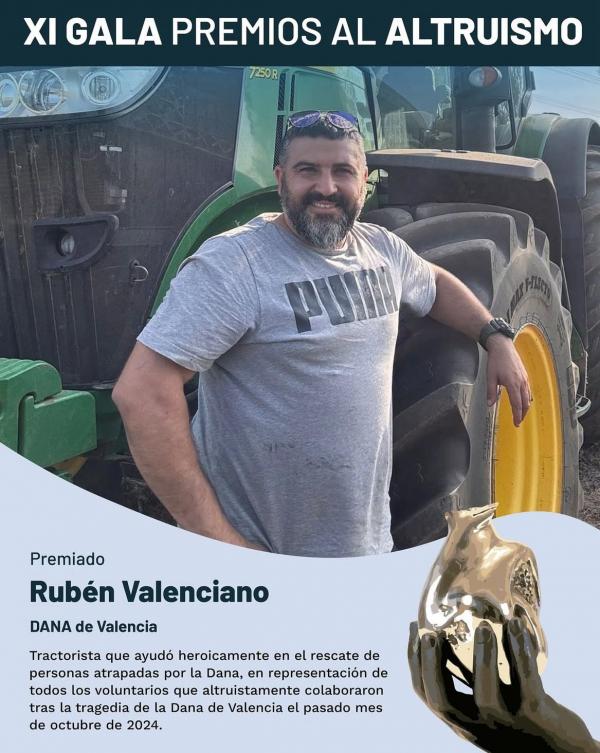 El agricultor requenense Rubén Valenciano, será uno de los cuatro galardonados en estos relevantes premios, por su heroica ayuda a galope de su tractor, en el rescate de las personas atrapadas por la DANA, en representación de todos los voluntarios que altruistamente colaboraron tras la tragedia vivida el pasado octubre de 2024.