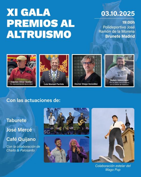 El próximo viernes, 3 de octubre, el polideportivo José Ramón de la Morena de Brunete, Madrid, acogerá la XI Gala de Premios al Altruismo, otorgados por La Fundación José Ramón de la Morena.