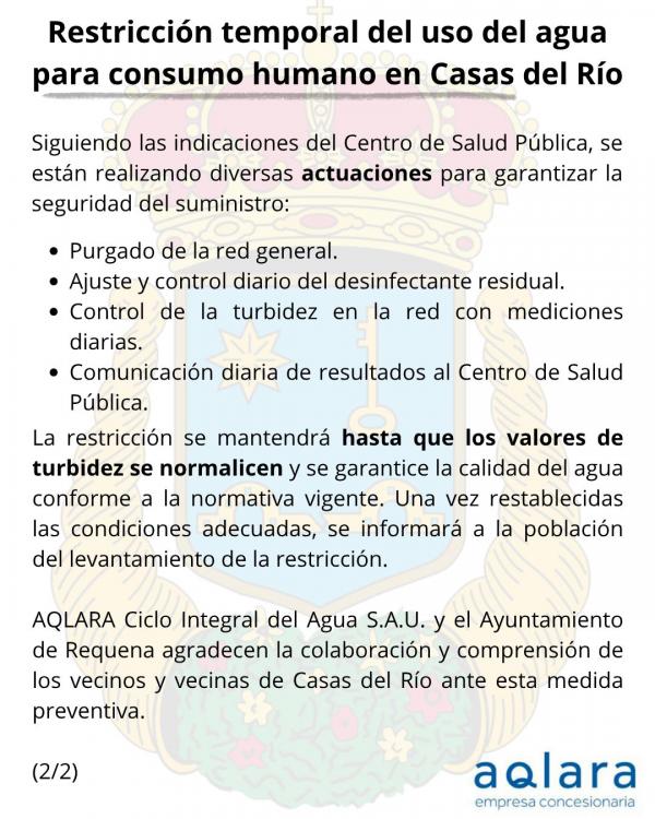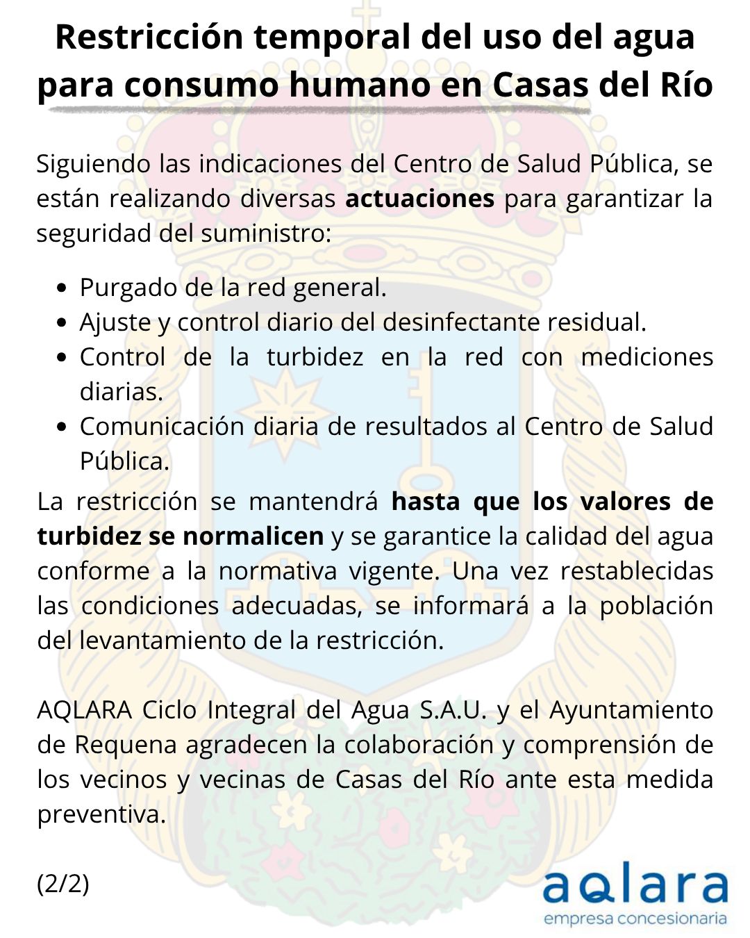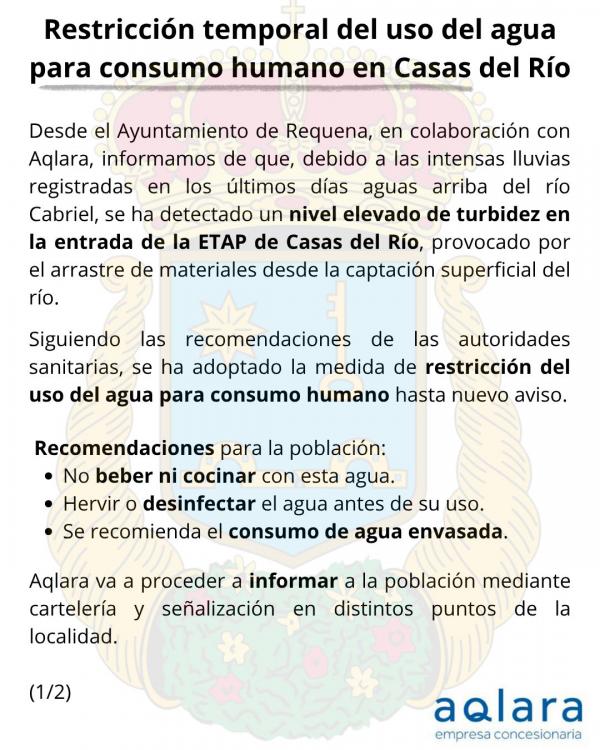 Desde el Ayuntamiento de Requena, en colaboración con Aqlara, informan que, debido a las intensas lluvias registradas en los últimos días aguas arriba del río Cabriel, se ha detectado un nivel elevado de turbidez en la entrada de la ETAP de Casas del Río.