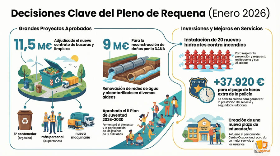 El pasado jueves 8 de enero se celebró el pleno municipal de Requena, donde se debatieron diversos asuntos de la gestión local y planificación estratégica. Los puntos clave incluyen la aprobación de créditos para pagar horas extra a la policía y la adjudicación de un importante contrato millonario para la recogida de residuos y limpieza urbana. Un tema central de la sesión es el Plan de Juventud 2026-2030, el cual genera una fuerte controversia ideológica entre los grupos políticos debido al uso de terminología relacionada con la perspectiva de género. Asimismo, se discute la Agenda de Reconstrucción tras los daños de la DANA, vinculada a la obtención de fondos europeos y a los objetivos de la Agenda 2030. El debate también aborda la regulación de impactos ambientales y olores, reflejando las tensiones políticas entre el equipo de gobierno y la oposición. Finalmente, el acto concluye con la despedida de la secretaria municipal y el reconocimiento a trabajadores jubilados del ayuntamiento.