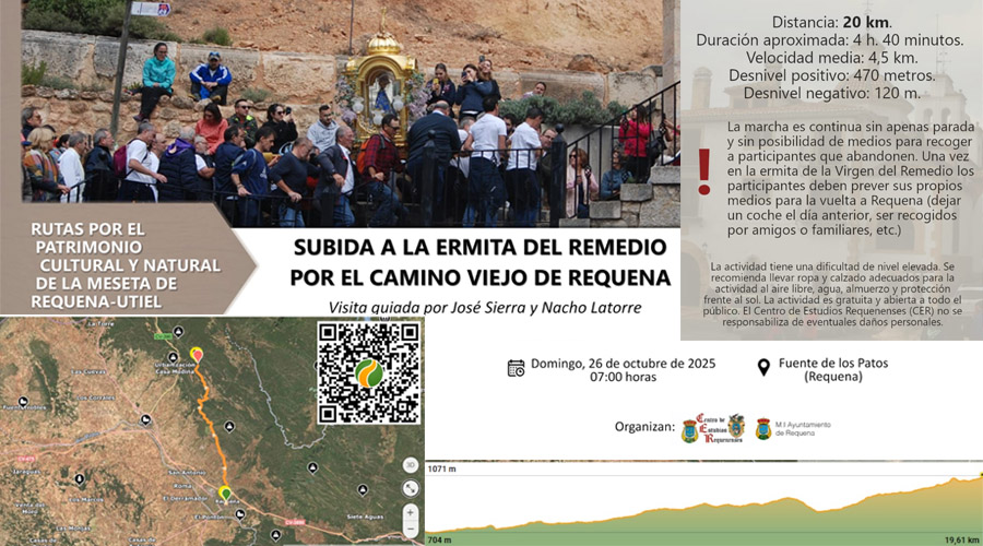 Aprovechando la tradicional subida de la Virgen del Remedio a su ermita el último domingo de octubre, andaremos el camino tradicional que desde Requena se hace hasta la ermita llamado camino de Rozaleme y carril de Cabañas al pie de la Sierra de Juan Navarro. Una caminata que nos permite admirar el paisaje otoñal meseteño y el de montaña atravesando ramblas con elementos patrimoniales como la propia ermita, molinos, casillas de campo, hormas de buena magnitud, etc.