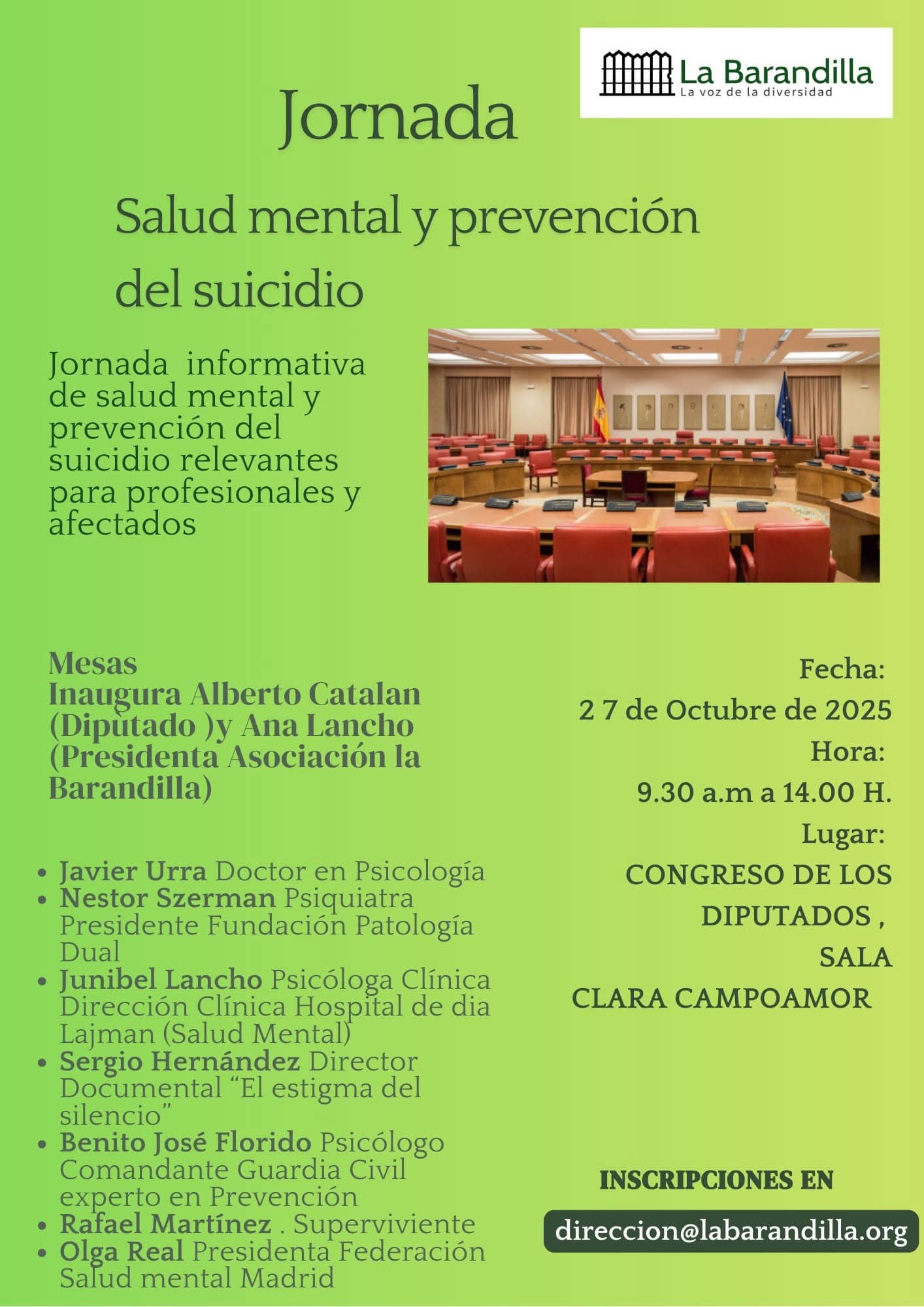 El próximo lunes, 27 de octubre, la Asociación La Barandilla organiza una importante Jornada sobre Salud Mental y Prevención del Suicidio en el Congreso de los Diputados, concretamente en la Sala Clara Campoamor. Quienes deseen asistir pueden inscribirse en el correo direccion@labarandilla.org.
