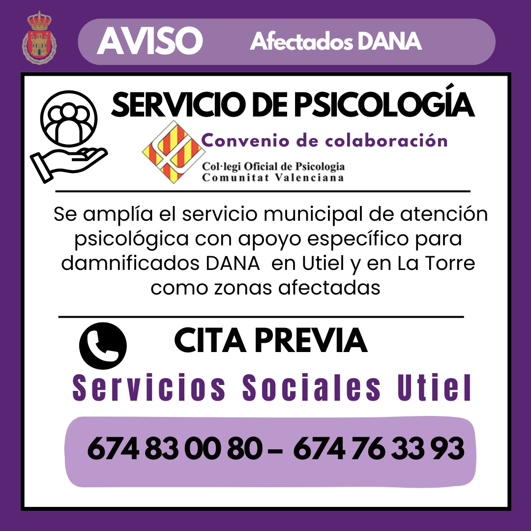 El área de Psicología del departamento de Servicios Sociales de Atención Primaria de Utiel ha ampliado sus servicios con la incorporación de una psicóloga específica para atender a damnificados por la DANA en el municipio, tanto en Utiel como en la pedanía de La Torre como zonas afectadas por las inundaciones.