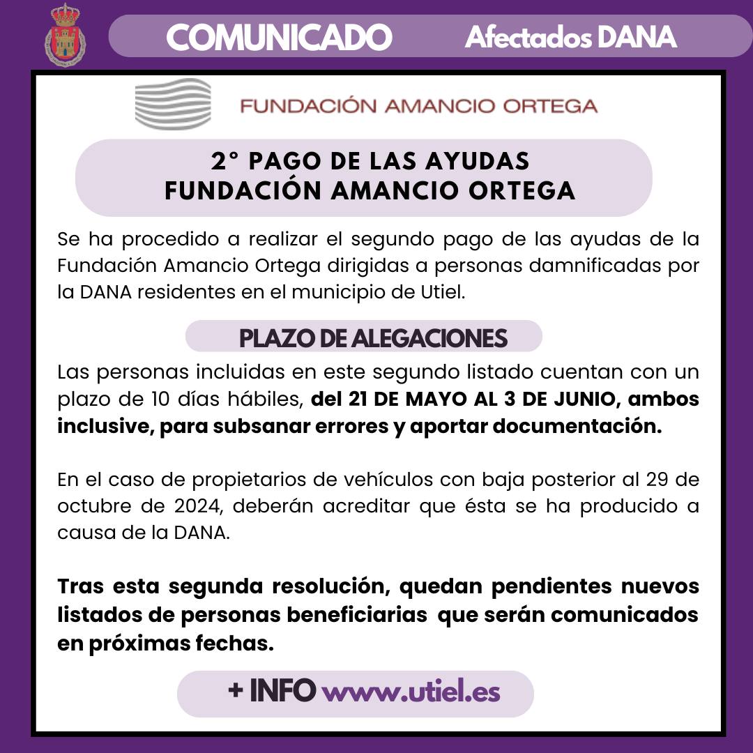 El Ayuntamiento de Utiel comunica que se ha procedido a realizar el segundo pago de las ayudas de la Fundación Amancio Ortega dirigidas a personas damnificadas por la DANA residentes en el municipio de Utiel.