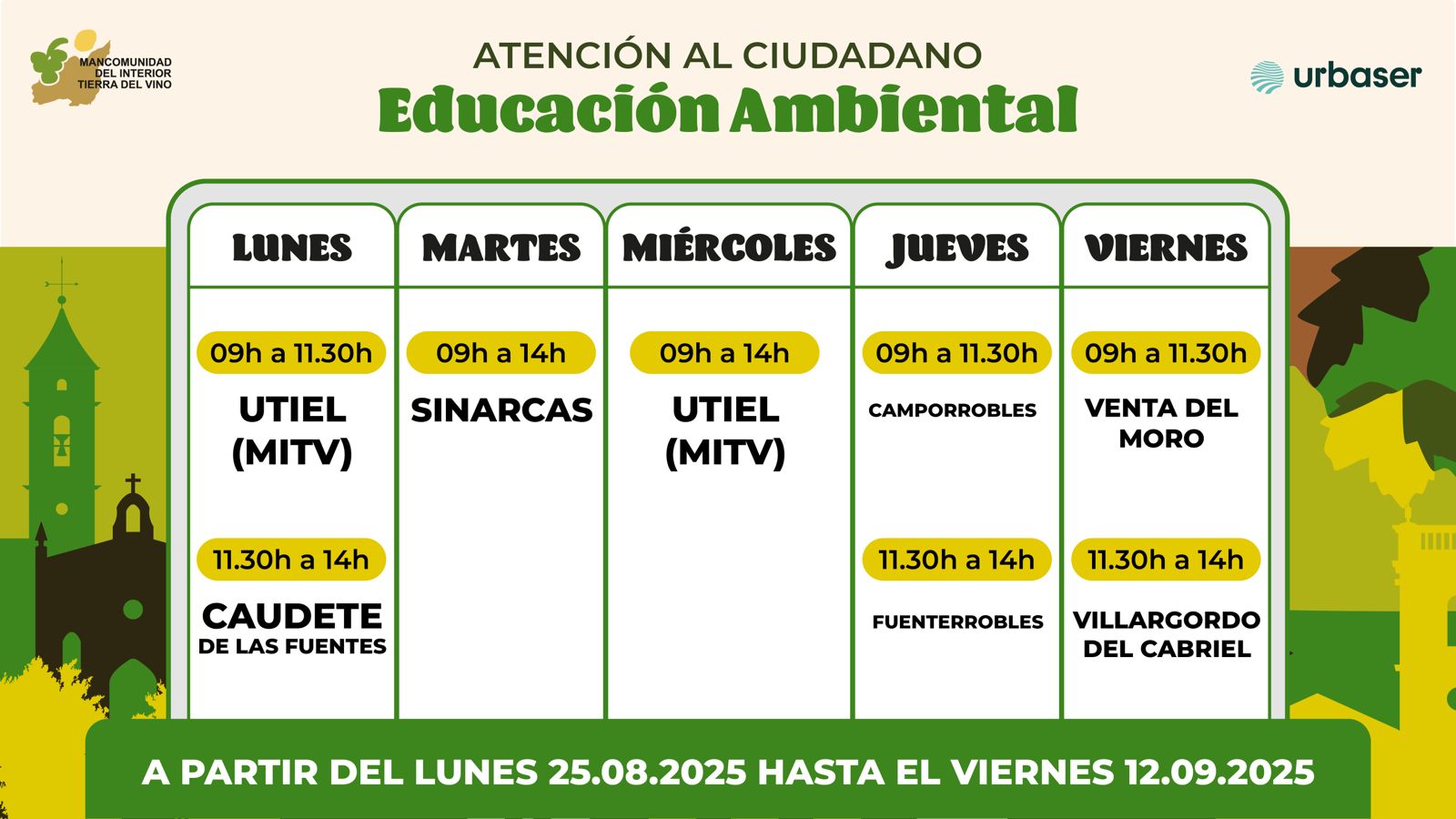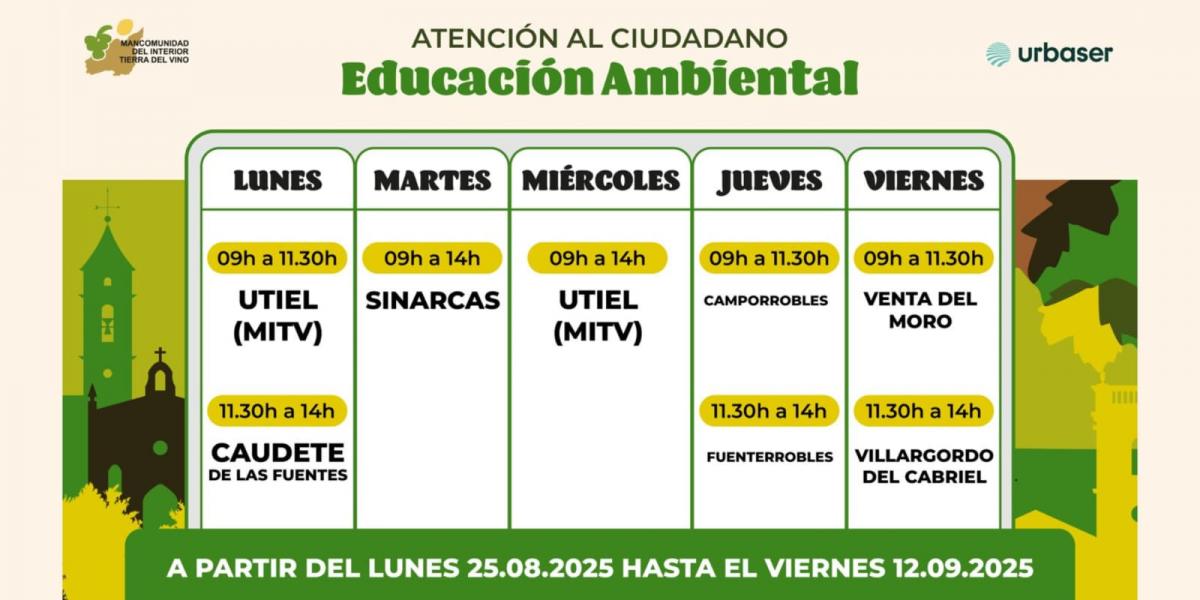 Desde esta semana, una educadora ambiental a jornada completa se encarga de acudir a los municipios a los que se presta servicio para resolver dudas, informar a la ciudadanía de las novedades del servicio de recogida y de atender quejas y sugerencias de la población. El grueso de las atenciones se realizará en Utiel, en las instalaciones de la MITV (calle Adarve, 5), los lunes de 9 a 11.30 horas y los miércoles de 9 a 14 horas. El resto de días, la educadora ambiental se desplazará por los diferentes municipios adheridos al servicio.