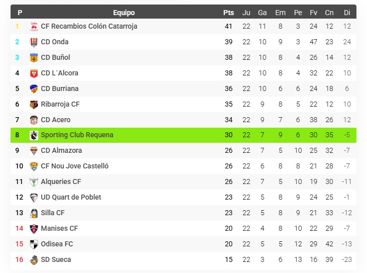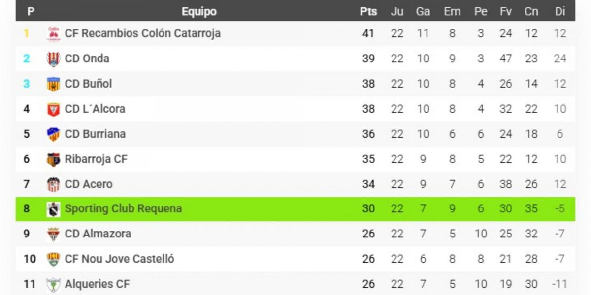 El S.C. Requena continua la racha con la que comenzó en el 2025 de donde de 27 puntos jugados ha sumado 20 que le han aupado a ocupar en solitario la octava plaza, una posición que está a cuatro puntos del C.D. Acero que es séptimo y cuatro puntos por encima del c.f. Nou Jove Castellón.