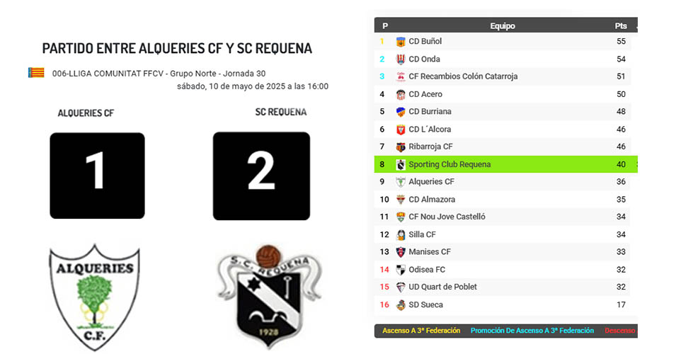 En las Instalaciones Deportivas de las Alquerías del Niño Perdido, con el sol apareciendo a ratos, temperatura de unos 20º y un número de espectadores cercano a los cien en los graderíos, tuvo lugar el último partido de Liga 2024-2025 correspondiente a la Liga Comunidad Grupo Norte, entre el Alquerías C.F. y nuestro S.C. Requena que finalizó con el marcador de un gol a dos favorable a los albinegros.