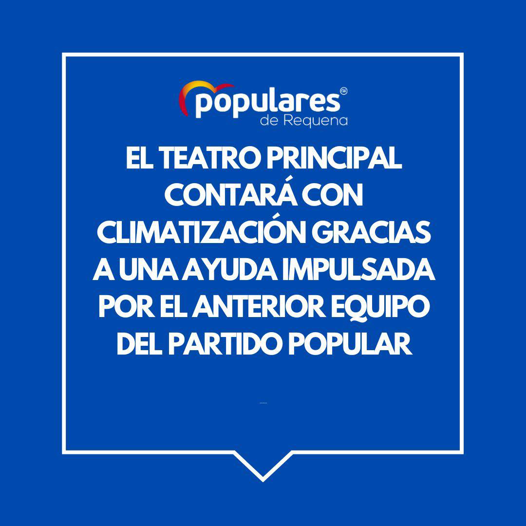 La Conselleria de Innovación, Industria y Turismo ha concedido al Ayuntamiento de Requena una ayuda de 188.032,62 euros para instalar climatización en el Teatro Principal. Se trata de una reivindicación histórica para nuestra ciudad que podrá hacerse realidad gracias a la gestión realizada durante el mandato del Partido Popular.