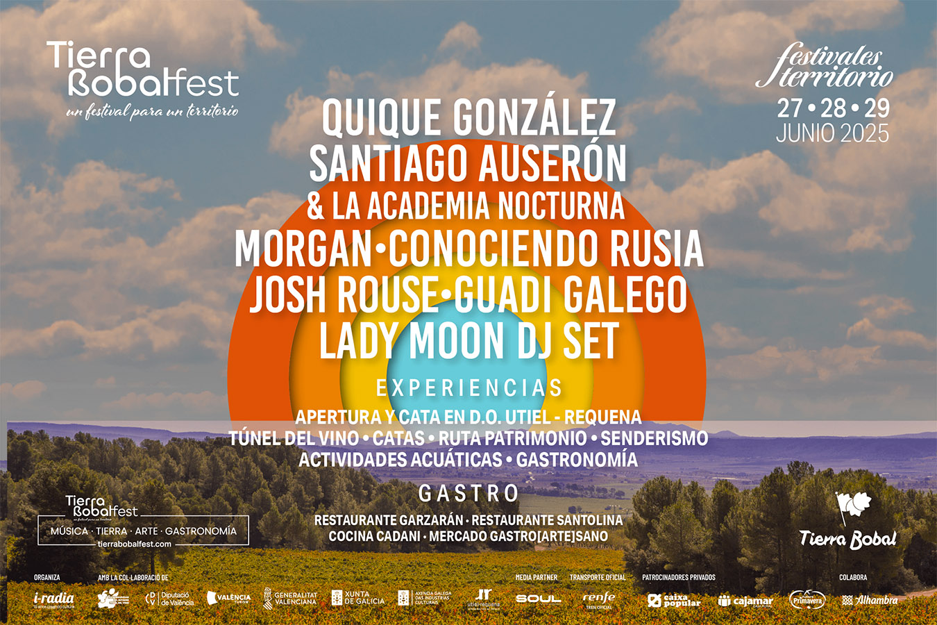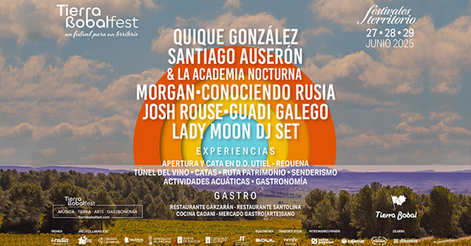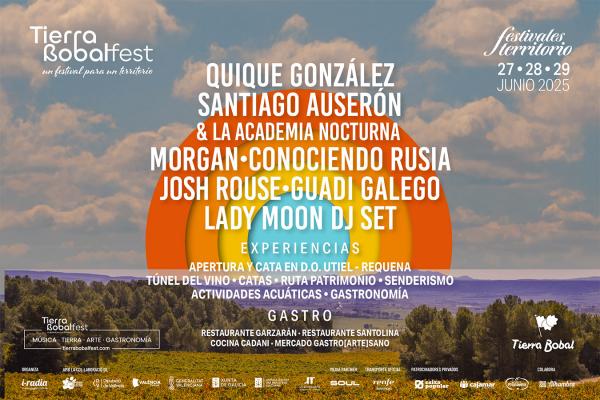 Tierra Bobal Fest presenta una programación que combina música en directo, patrimonio, vino, estrellas y naturaleza. Con conciertos que se repartirán por diferentes escenarios o bodegas locales, el público podrá disfrutar en enclaves especiales de artistas como Quique González, un referente del rock español de autor; Santiago Auserón & La Academia Nocturna, conocido por formar parte de uno de los grupos más destacados de la Movida Madrileña, Radio Futura; desde Argentina llegará Conociendo Rusia, una de las bandas con más proyección internacional de latinoamérica y Premio Grammy Latino a la Mejor Canción Pop/Rock por “Cinco horas menos”. Además, recientemente el festival sumó a la banda Morgan a su cartel, uno de los grupos más queridos y auténticos de la escena nacional.