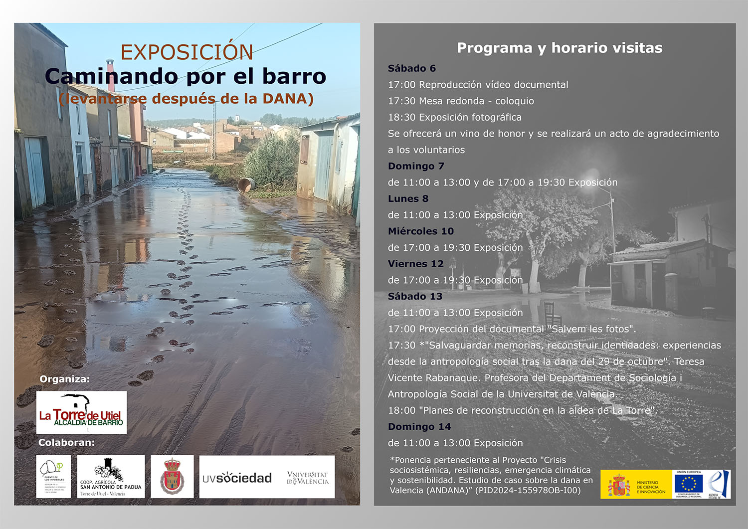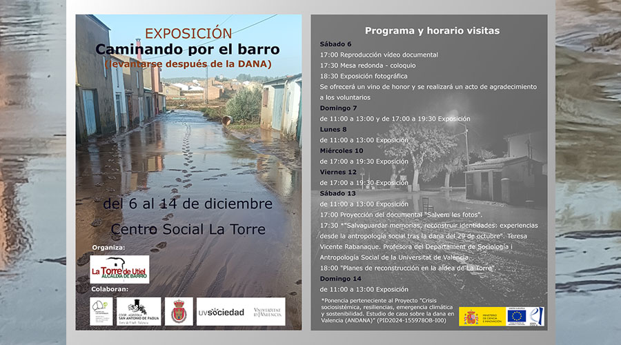 La Aldea de La Torre de Utiel invita a la ciudadanía a un encuentro con su propia historia reciente a través de la exposición “Caminando por el barro (Levantarse después de la DANA)”, que podrá visitarse del 6 al 14 de diciembre en el Centro Social La Torre.