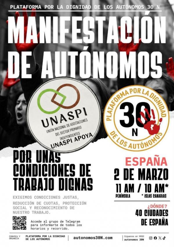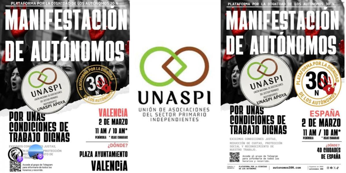 La Unión Nacional de Asociaciones del Sector Primario Independientes (UNASPI), manifiesta su apoyo y participación activa en las concentraciones que tendrán lugar hoy lunes, 2 de marzo, en diversas ciudades de todo el territorio nacional.