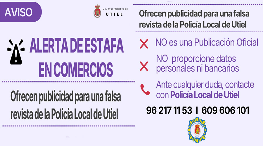 El Ayuntamiento de Utiel ha lanzado una alerta ante varios intentos de estafa detectados en comercios del municipio, relacionados con la supuesta contratación de publicidad en una falsa revista oficial de la Policía Local.