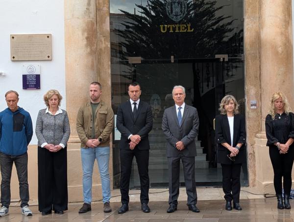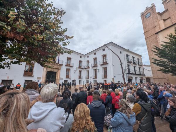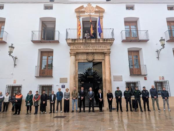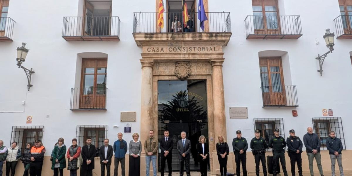 El acto, celebrado en la Plaza del Ayuntamiento de Utiel con las banderas a media asta y crespón negro, ha reunido a numerosos vecinos que han querido mostrar sus condolencias por los 6 vecinos fallecidos en Utiel y como acompañamiento a todas las personas que están sufriendo las consecuencias de la DANA.