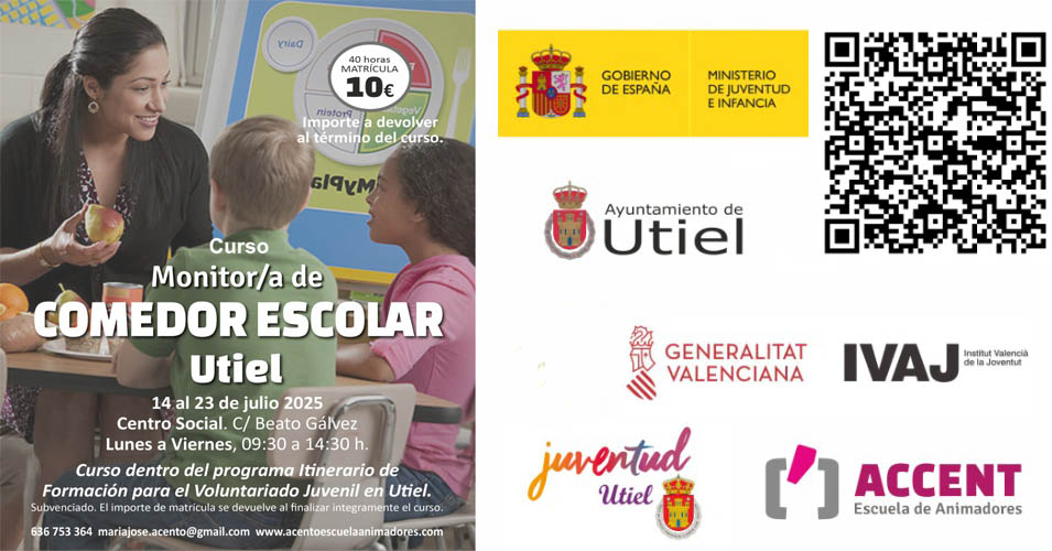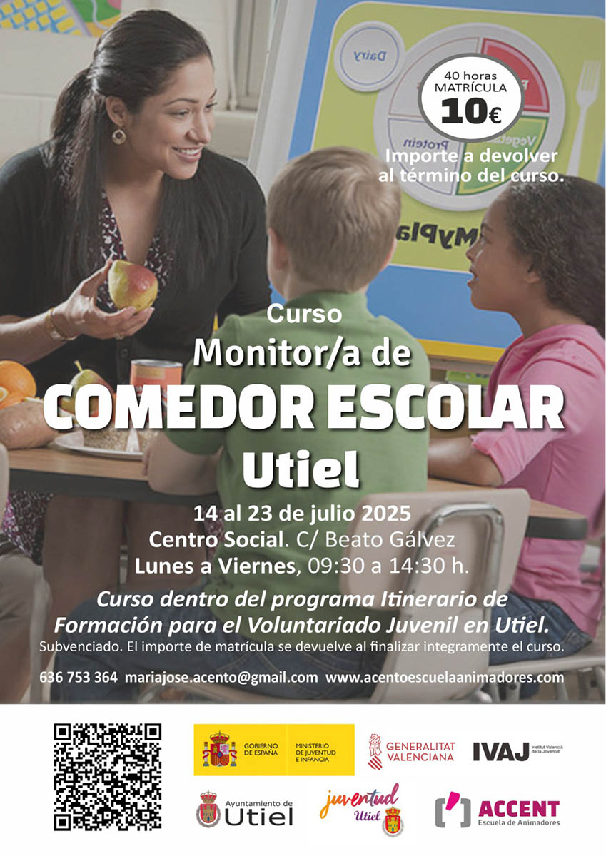 El Ayuntamiento de Utiel, a través del área de Juventud, organiza el curso de Monitor/a de Comedor Escolar que se impartirá en el Centro Social de Utiel del 14 al 23 de julio en horario de 9.30 a 14.30 horas.