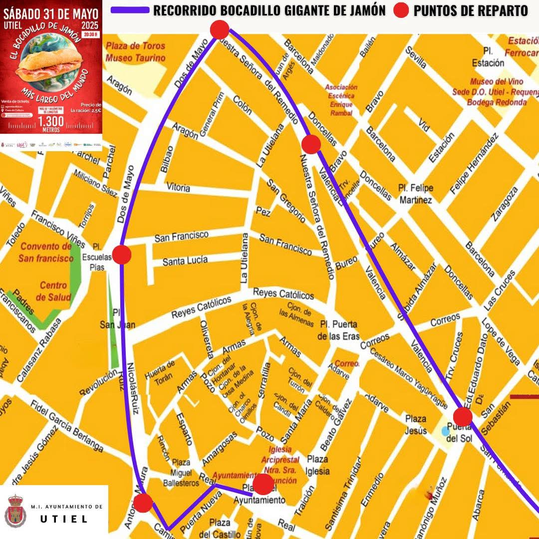 Desde la Plaza del Ayuntamiento de Utiel el bocadillo recorrerá las calles Puerta Nueva, Camino, Nicolas Ruiz, Plaza de San Juan , Dos de Mayo, Nuestra Señora del Remedio, Valencia para finalizar el recorrido gastronómico en Plaza Puerta del Sol y San Fernando.