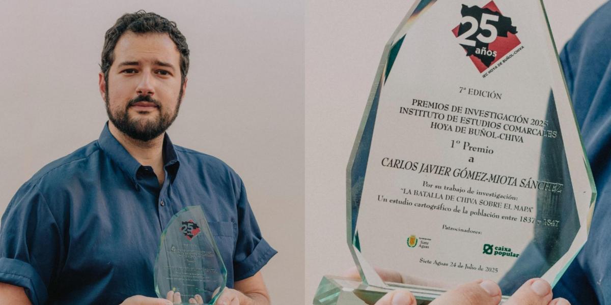 El utielano Carlos Javier Gómez Miota Sánchez ha obtenido el Primer Premio de Investigación Comarcal 2025, otorgado por el Instituto de Estudios Comarcales Hoya de Buñol Chiva (IEC La Hoya), gracias a su estudio titulado “La batalla de Chiva sobre el mapa”: un estudio cartográfico de la población entre 1837 y 1847. La entrega del premio tuvo lugar el pasado 25 de julio en Siete Aguas.