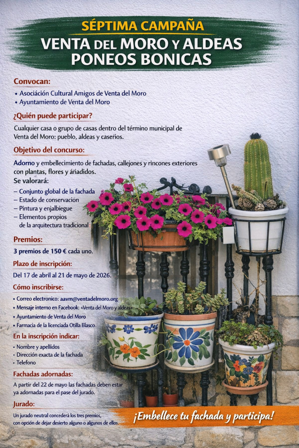 El plazo de inscripción permanecerá abierto del 17 de abril al 21 de mayo de 2026. Las personas interesadas podrán formalizar su participación a través del correo electrónico aavm@ventadelmoro.org. , mediante mensaje interno en la página de Facebook “Venta del Moro y Aldeas”, o de forma presencial en el Ayuntamiento y en la Farmacia de la licenciada Otilia Blasco. En la inscripción deberá constar el nombre y apellidos del participante, la dirección exacta de la fachada y un teléfono de contacto.